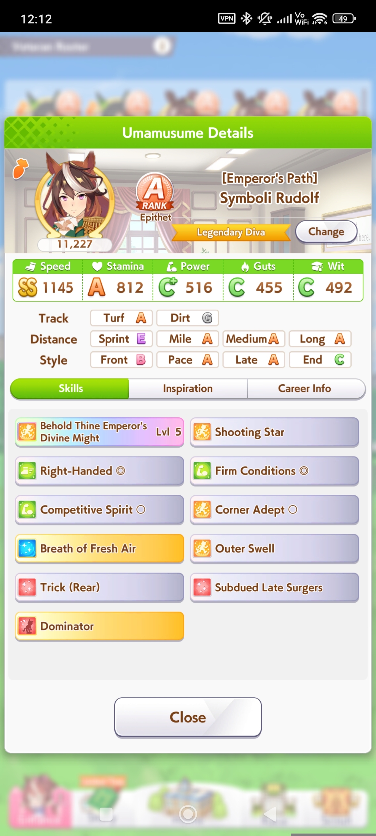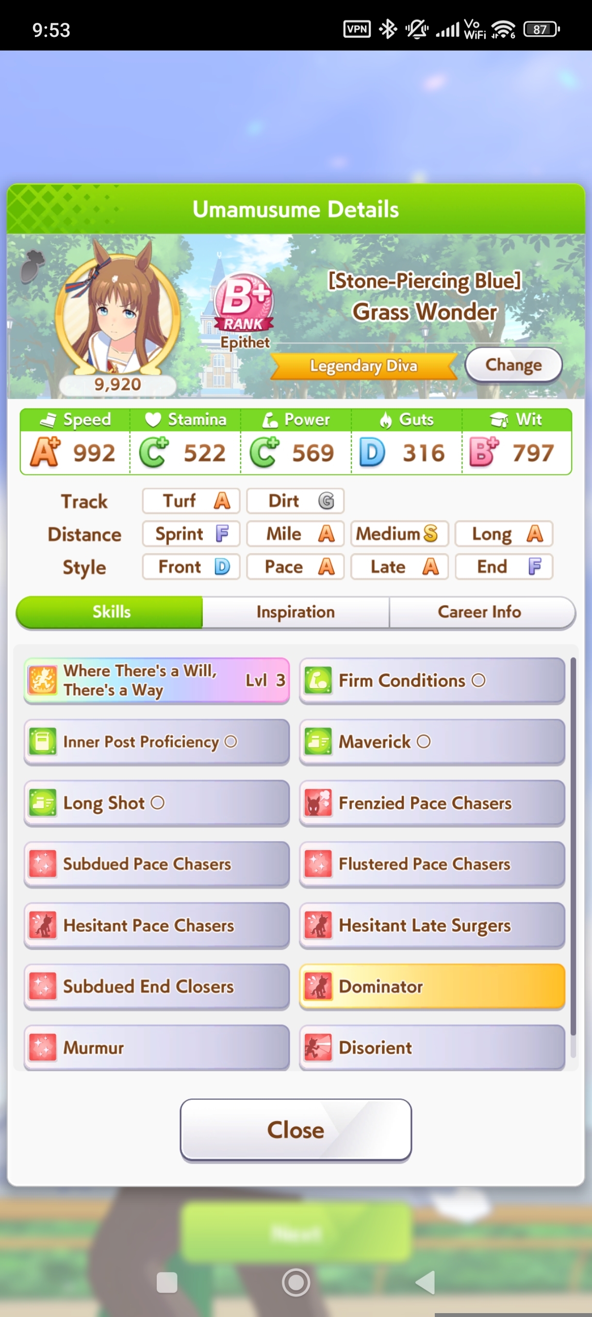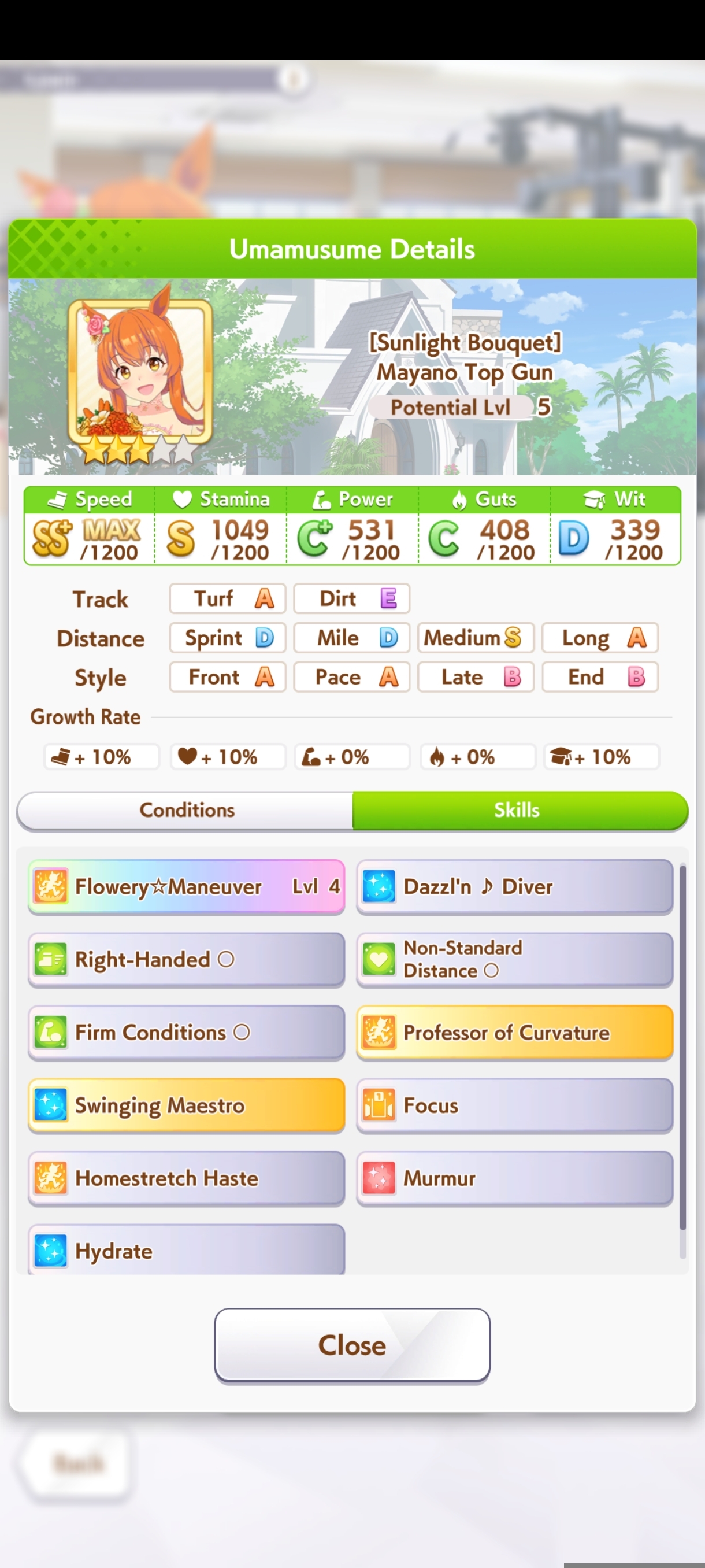 Je ressors de deux runs Mayano avec borrow : unlucky. 1ere useless, seconde avec un superbe panier de skills (2 gold reco, tous les accel uniques en pace, du prof, du step, du straigth, du debuff), une stam S+ mais un speed aux fraises, faute de rainbow.
