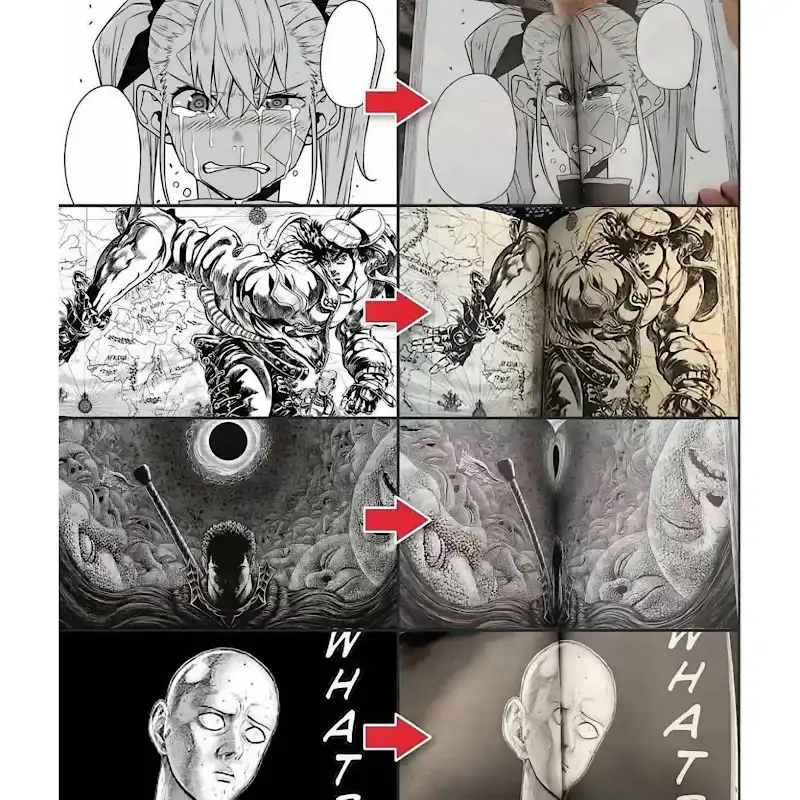 Alors en l'occurrence, c'est le vieux dessin d'Araki sur JJBA Battle Tendency qui est correct sur format tankôbon et montre la différence de philosophie d'une époque à l'autre : sur format numérique, le bras super-long de Joseph est bien disgracieux, par contre avec la coupure et la courbe entre les deux pages sur format papier, la longueur du bras est réajustée. :aloy1