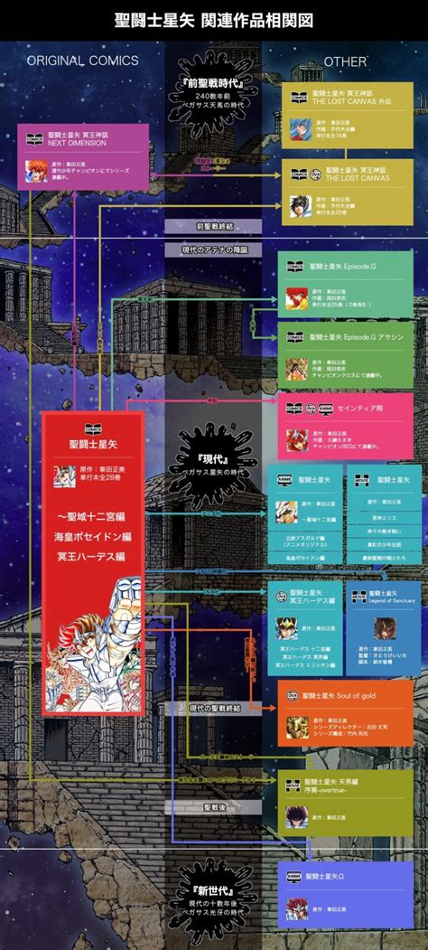 - une flèche part de Saint Seiya pour rejoindre Saint Seiya Next Dimension et le texte est : 正統続編