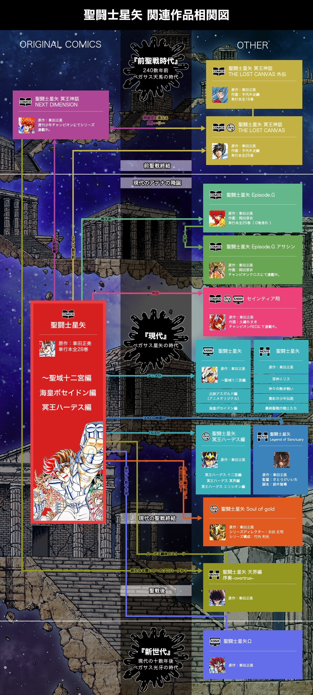 Tous ont été conçu sur la même base de laisser leurs auteurs respectifs offrir leur visions de Saint Seiya, auteurs qui ont tous été choisis personnellement par Masami Kurumada. Et tous ont été consulté par le maître (qui a parfois fourni la base ou des idées) mais qui reste volontairement en retrait afin de laisser à chaque auteur une liberté totale. Et tous s'inscrit dans leur propre continuité avec pour seule base la manga original même si parfois les auteurs, fans eux aussi, vont faire des références à leurs confrères/consœurs ou à l'anime.